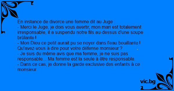 - Merci le Juge, je dois vous avertir, mon mari est totalement irresponsable, il a suspendu notre fils au-dessus d'une soupe brûlante !