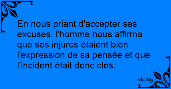 En nous priant d'accepter ses excuses, l'homme nous affirma que ses injures étaient bien l'expression de sa pensée et que l'incident était donc clos.