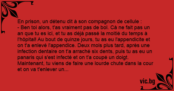 - Ben toi alors, t'as vraiment pas de bol. Cà ne fait pas un an que tu es ici, et tu as déjà passé la moitié du temps à l'hôpital! Au bout de quinze jours, tu as eu l'appendicite et on t'a enlevé l'appendice. Deux mois plus таrd, après une infection dentaire on t'a arraché six dents, puis tu as eu un panaris qui s'est infecté et on t'a coupé un doigt. Maintenant, tu viens de faire une lourde chute dans la cour et on va t'enlever un ménisque. Tu es vraiment né sous une mauvaise éтоilе!