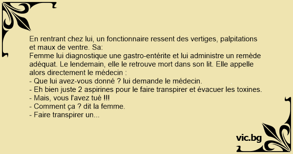 En rentrant chez lui, un fonctionnaire ressent des vertiges, palpitations et maux de ventre. Sa: Femme lui diagnostique une gastro-entérite et lui administre un remède adéquat. Le lendemain, elle le retrouve mort dans son lit. Elle appelle alors directement le médecin : - Que lui avez-vous donné ? lui demande le médecin. - Eh bien juste 2 aspirines pour le faire transpirer et évacuer les toxines. - Mais, vous l'avez tué !!! - Comment ça ? dit la femme. - Faire transpirer un fonctionnaire, ça le tue...
