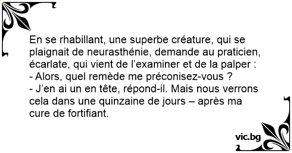 En se rhabillant, une superbe créature, qui se plaignait de neurasthénie, demande au praticien, écarlate, qui vient de l’examiner et de la palper :