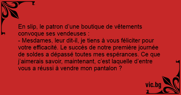 En slip, le patron d’une boutique de vêtements convoque ses vendeuses : - Mesdames, leur dit-il, je tiens à vous féliciter pour votre efficacité. Le succès de notre première journée de soldes a dépassé toutes mes espérances. Ce que j’aimerais savoir, maintenant, c’est laquelle d’entre vous a réussi à vendre mon pantalon ?