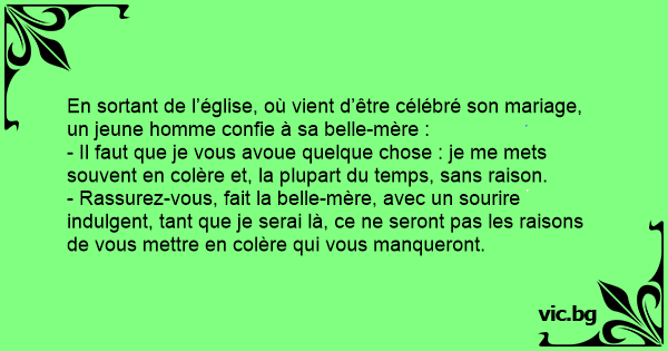 - Rassurez-vous, fait la belle-mère, avec un sourire indulgent, tant que je serai là, ce ne seront pas les raisons de vous mettre en colère qui vous manqueront.