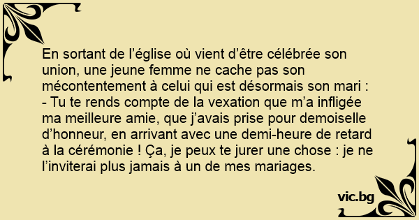 - Tu te rends compte de la vexation que m’a infligée ma meilleure amie, que j’avais prise pour demoiselle d’honneur, en arrivant avec une demi-heure de rетаrd à la cérémonie ! Ça, je peux te jurer une chose : je ne l’inviterai plus jamais à un de mes mariages.