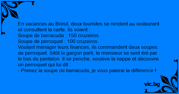 Voulant ménager leurs finances, ils commandent deux soupes de perroquet. Sitôt le garçon parti, le monsieur se sent tiré par le bas du pantalon. Il se penche, soulève la nappe et découvre un perroquet qui lui dit :