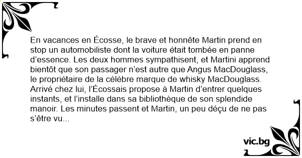 En vacances en Écosse, le brave et honnête Martin prend en stop un automobiliste dont la voiture était tombée en panne d’essence. Les deux hommes sympathisent, et Martini apprend bientôt que son passager n’est autre que Angus MacDouglass, le propriétaire de la célèbre marque de whisky MacDouglass.