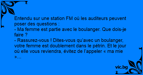 - Rassurez-vous ! Dites-vous qu’avec un boulanger, votre femme est doublement dans le pétrin. Et le jour où elle vous reviendra, évitez de l’appeler « ma mie »…