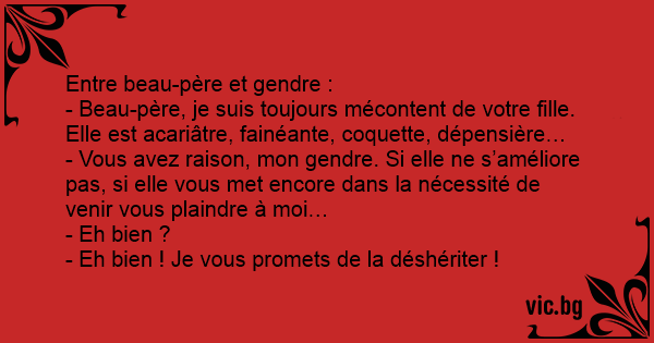 - Beau-père, je suis toujours mécontent de votre fille. Elle est acariâtre, fainéante, coquette, dépensière…
