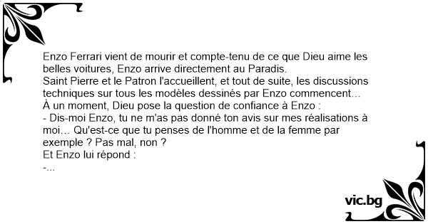 Enzo Ferrari vient de mourir et compte-tenu de ce que Dieu aime les belles voitures, Enzo arrive directement au Paradis.
