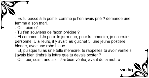 - Et, puisque tu as une telle mémoire, te rappelles-tu avoir vérifié si j’avais bien timbré la lettre que tu devais poster ?