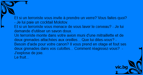 Et si un terroriste vous invite à prendre un verre? Vous faites quoi? - Je lui paie un cocktail Molotov.