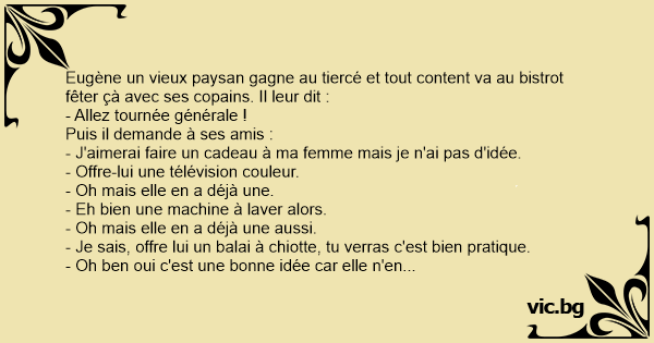 Eugène un vieux paysan gagne au tiercé et tout content va au bistrot fêter çà avec ses copains. Il leur dit :