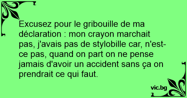 Excusez pour le gribouille de ma déclaration : mon crayon marchait pas, j'avais pas de stylobille car, n'est-ce pas, quand on part on ne pense jamais d'avoir un accident sans ça on prendrait ce qui faut.