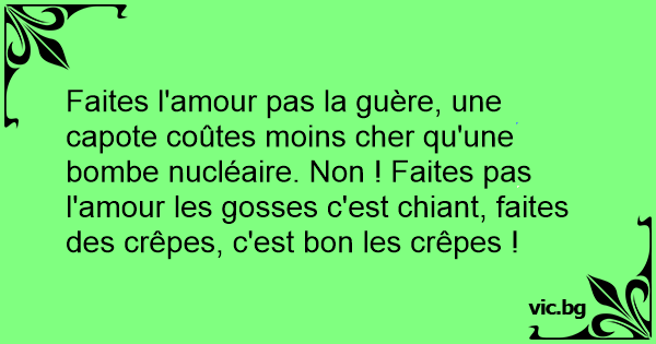 Faites l'amour pas la guère, une capote coûtes moins cher qu'une bombe nucléaire. Non ! Faites pas l'amour les gosses c'est chiant, faites des crêpes, c'est bon les crêpes !