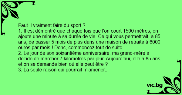 1. Il est démontré que chaque fois que l'on court 1500 mètres, on ajoute une minute à sa durée de vie. Ce qui vous permettrait, à 85 ans, de passer 5 mois de plus dans une maison de retraite à 6000 euros par mois ! Donc, commencez tout de suite...