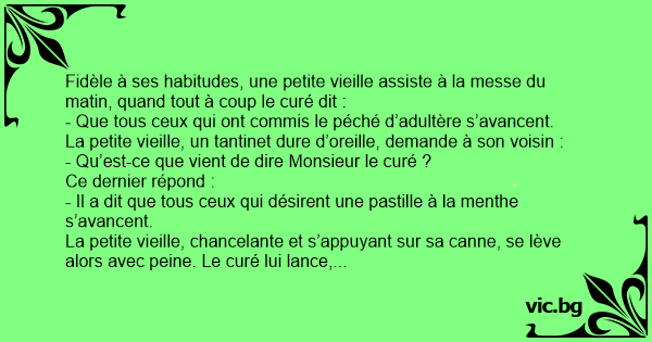 Fidèle à ses habitudes, une petite vieille assiste à la messe du matin, quand tout à coup le curé dit :