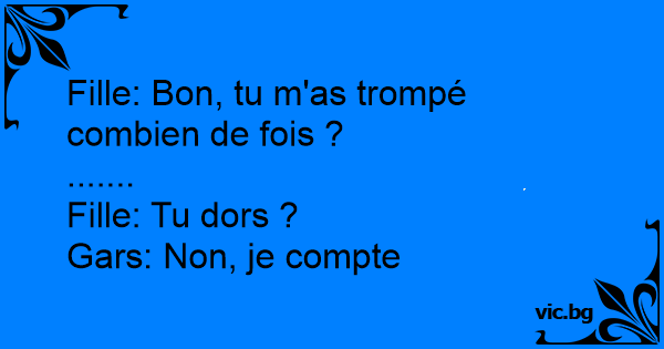 Avant de s'endormir , un mari demande à sa femme :combien as-tu eu d'amant avant de me connaître ?? Après un très long silence le mari dis : - tu dors ?? - non je compte !! Alors cette blague sur...
