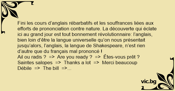 Fini les cours d’anglais rébarbatifs et les souffrances liées aux efforts de prononciation contre nature. La découverte qui éclate ici au grand jour est tout bonnement révolutionnaire: l’anglais, bien lоin d’être la langue universelle qu’on nous présentait jusqu’alors, l’anglais, la langue de Shakespeare, n’est rien d’autre que du français mal prononcé !