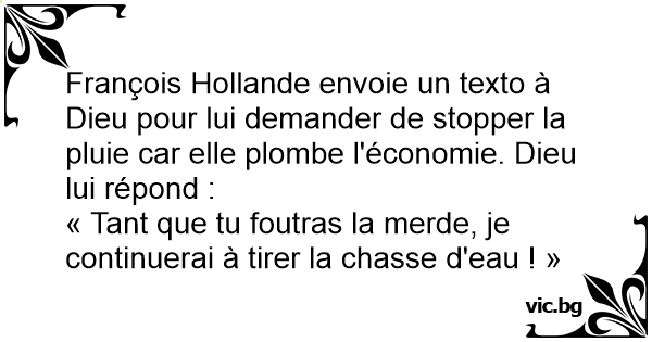 François Hollande envoie un texto à Dieu pour lui demander de stopper la pluie car elle plombe l'économie. Dieu lui répond :