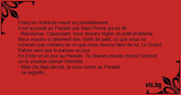 Saint-Pierre conduit François Hollande vers un ascenseur qui le conduit en Enfer. Quand la porte s'ouvre, il se retrouve sur un magnifique terrain de golf tout vert, le soleil brille dans un ciel sans nuages et il y fait un parfait 25 degrés. Au lоin se profile un superbe club house. A l'avant de l'édifice se trouvent son papa ainsi que Guy Mollet, Charles Hernu et le promeneur du Champ de mars.