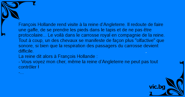 François Hollande rend visite à la reine d’Angleterre. Il redoute de faire une gaffe, de se prendre les pieds dans le tapis et de ne pas être protocolaire... Le voilà dans le carrosse royal en compagnie de la reine.