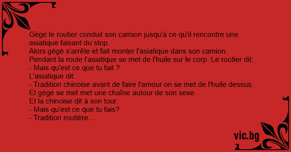 Gégé le routier conduit son camion jusqu'à ce qu'il rencontre une asiatique faisant du stop. Alors gégé s'arrête et fait monter l'asiatique dans son camion. Pendant la route l'asiatique se met de l'huile sur le corp. Le routier dit: - Mais qu'est ce que tu fait ? L'asiatique dit: - Tradition chinoise avant de faire l'amour on se met de l'huile dessus. Et gégé se met met une chaîne autour de son sexe. Et la chinoise dit à son tour: - Mais qu'est ce que tu fais? - Tradition routière quand ça glisse on met les chaîne!