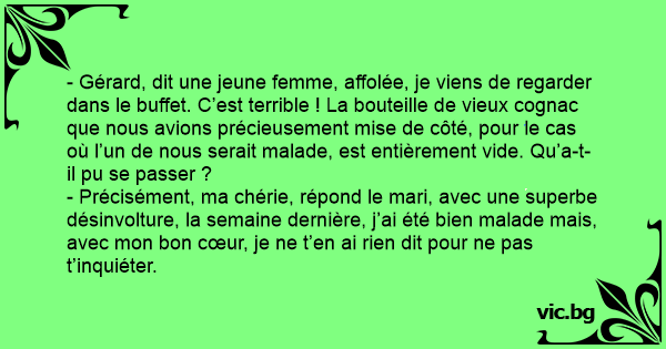 - Gérard, dit une jeune femme, affolée, je viens de regarder dans le buffet. C’est terrible ! La bouteille de vieux cognac que nous avions précieusement mise de côté, pour le cas où l’un de nous serait malade, est entièrement vide. Qu’a-t-il pu se passer ?