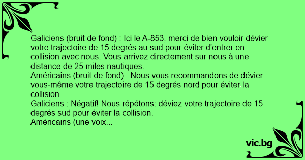 Galiciens (bruit de fond) : Ici le A-853, merci de bien vouloir dévier votre trajectoire de 15 degrés au sud pour éviter d'entrer en collision avec nous. Vous arrivez directement sur nous à une distance de 25 miles nautiques.