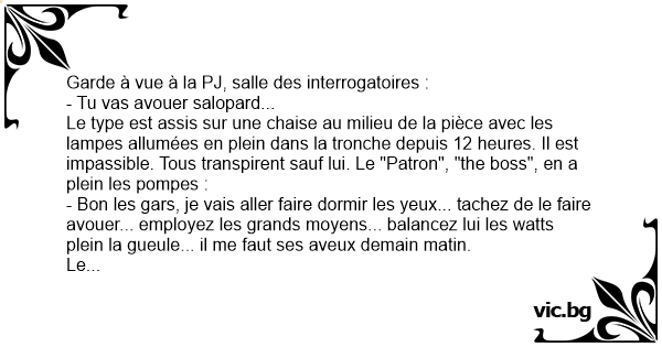 - Bon les gars, je vais aller faire dormir les yeux... tachez de le faire avouer... employez les grands moyens... balancez lui les watts plein la gueule... il me faut ses aveux demain matin.