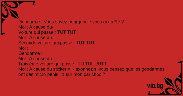 Moi : A cause du sticker « Klaxonnez si vous pensez que les gendarmes ont des micro-pénis ! » sur mon par choc ?