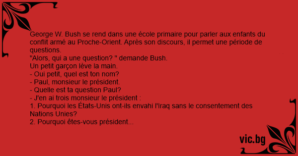 La cloche annonçant la récréation se met alors à sonner. Bush dit qu'il poursuivra la période de questions après la récréation. Au retour, Bush demande :