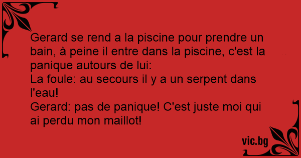 Gerard se rend a la piscine pour prendre un bain, à peine il entre dans la piscine, c'est la panique autours de lui:<br />La foule: au secours il y a un serpent dans l'eau!<br />Gerard: pas de panique! C'est juste moi qui ai perdu mon maillot!