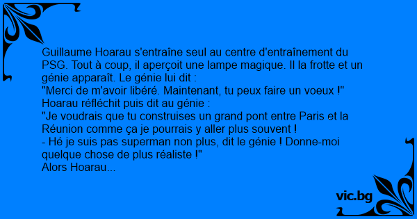Guillaume Hoarau s'entraîne seul au centre d'entraînement du PSG. Tout à coup, il aperçoit une lampe magique. Il la frotte et un génie apparaît. Le génie lui dit :