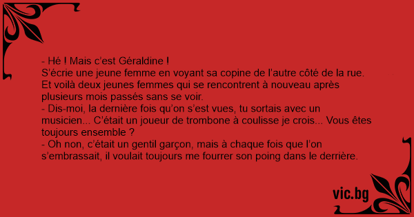 - Dis-moi, la dernière fois qu’on s’est vues, tu sortais avec un musicien... C’était un joueur de trombone à coulisse je crois... Vous êtes toujours ensemble ?