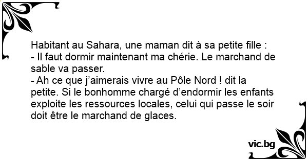 - Ah ce que j’aimerais vivre au Pôle Nord ! dit la petite. Si le bonhomme chargé d’endormir les enfants exploite les ressources locales, celui qui passe le soir doit être le marchand de glaces.