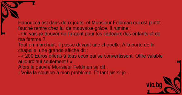 Hanoucca est dans deux jours, et Monsieur Feldman qui est plutôt fauché rentre chez lui de mauvaise grâce. Il rumine :