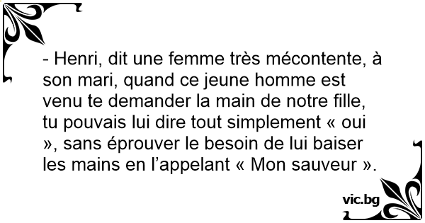 - Henri, dit une femme très mécontente, à son mari, quand ce jeune homme est venu te demander la main de notre fille, tu pouvais lui dire tout simplement « oui », sans éprouver le besoin de lui baiser les mains en l’appelant « Mon sauveur ».