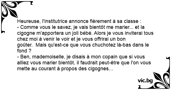 - Ben, mademoiselle, je disais à mon copain que si vous alliez vous marier bientôt, il faudrait peut-être que l'on vous mette au courant à propos des cigognes…