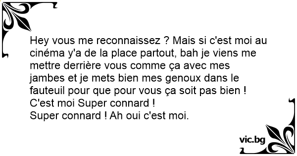Hey vous me reconnaissez ? Mais si c'est moi au cinéma y'a de la place partout, bah je viens me mettre derrière vous comme ça avec mes jambes et je mets bien mes genoux dans le fauteuil pour que pour vous ça soit pas bien !