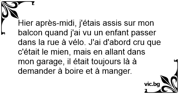Hier après-midi, j'étais assis sur mon balcon quand j'ai vu un enfant passer dans la rue à vélo. J'ai d'abord cru que c'était le mien, mais en allant dans mon garage, il était toujours là à demander à boire et à manger.