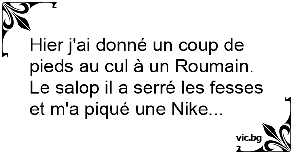 Hier j'ai donné un coup de pieds au cul à un Roumain. Le salop il a serré les fesses et m'a piqué une Nike...