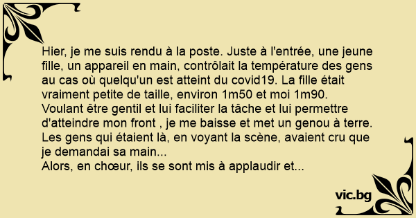 Hier, je me suis rendu à la poste. Juste à l'entrée, une jeune fille, un appareil en main, contrôlait la température des gens au cas où quelqu'un est atteint du covid19. La fille était vraiment petite de taille, environ 1m50 et moi 1m90.