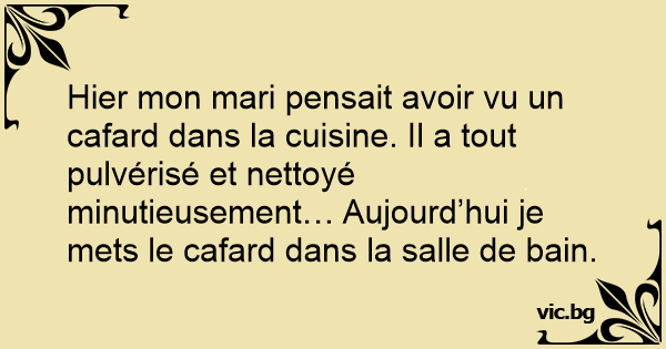 Hier mon mari pensait avoir vu un cafard dans la cuisine. Il a tout pulvérisé et nettoyé minutieusement… Aujourd’hui je mets le cafard dans la salle de bain.