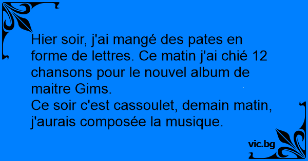 Hier soir, j'ai mangé des pates en forme de lettres. Ce matin j'ai chié 12 chansons pour le nouvel album de maitre Gims.