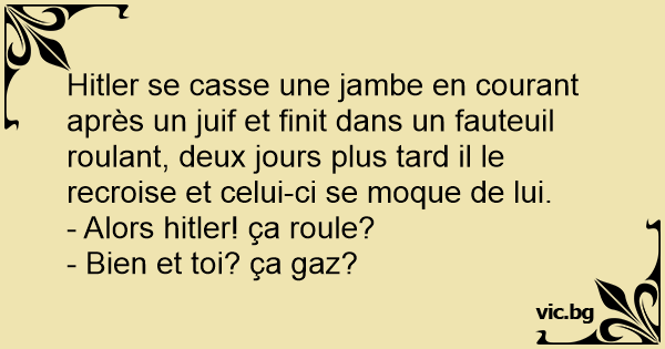 Нiтlеr se casse une jambe en courant après un juif et finit dans un fauteuil roulant, deux jours plus таrd il le recroise et celui-ci se moque de lui.