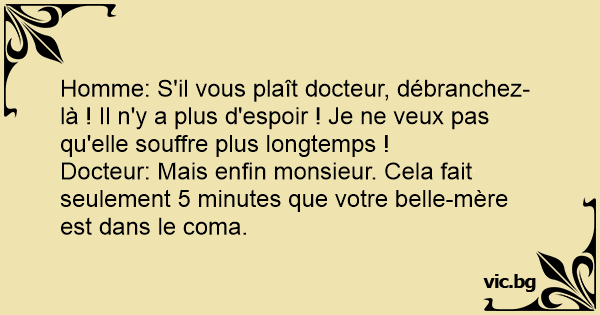 Docteur: Mais enfin monsieur. Cela fait seulement 5 minutes que votre belle-mère est dans le coma.