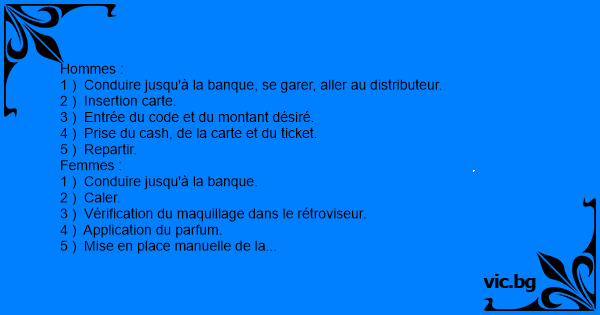 Hommes : 1 ) Conduire jusqu'à la banque, se garer, aller au distributeur. 2 ) Insertion carte. 3 ) Entrée du code et du montant désiré. 4 ) Prise du cash, de la carte et du ticket. 5 ) Repartir. Femmes : 1 ) Conduire jusqu'à la banque. 2 ) Caler. 3 ) Vérification du maquillage dans le rétroviseur. 4 ) Application du parfum. 5 ) Mise en place manuelle de la chevelure. 6 ) Aller au distributeur. 7 ) Recherche de la carte dans le sac à main. 8 ) Insertion carte. 9 ) Récupérer la carte rejetée par l'appareil. 9 bis ) Jeter la carte téléphonique au fond du sac. 10 ) Recherche de la carte bancaire. 11 ) Insertion carte. 12 ) Recherche de la boite de tampons (sur laquelle est inscrit le code secret) dans le sac à main. 13 ) Entrée du code. 14 ) Etude des instructions pendant 2 minutes. 15 ) « Annulation ». 16 ) Re-entrée du code. 17 ) « Annulation ». 18 ) Téléphoner au copain/mari pour avoir le bon code. 19 ) Entrée du montant. 20 ) « Erreur ». 21 ) Entrée d'un montant plus important. 22 ) « Erreur ». 23 ) Entrée du montant maximum. 24 ) Croisement de doigts. 25 ) Saisie du cash. 26 ) Retour à la voiture. 27 ) Vérification du maquillage dans le rétroviseur. 28 ) Recherche des clés dans le sac à main. 29 ) Démarrage de la voiture. 30 ) Vérification du maquillage dans le rétroviseur. 31 ) Rouler sur 50 mètres. 32 ) Freinage brutal. 33 ) Retour au distributeur. 34 ) Sortie de la voiture. 35 ) Récupération de la carte et du ticket. 36 ) Retour a la voiture. 37 ) Jet de la carte sur la plage avant. 38 ) Jet du ticket par terre. 39 ) Vérification du maquillage dans le rétroviseur. 40 ) Mise en place manuelle de la chevelure. 41 ) Parcourir 5 kilomètres. 42 ) Enlever le frein à main.