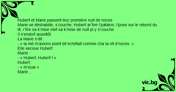 - « la mé m’avions point dit kchétait comme cha la nit d’noces. ».