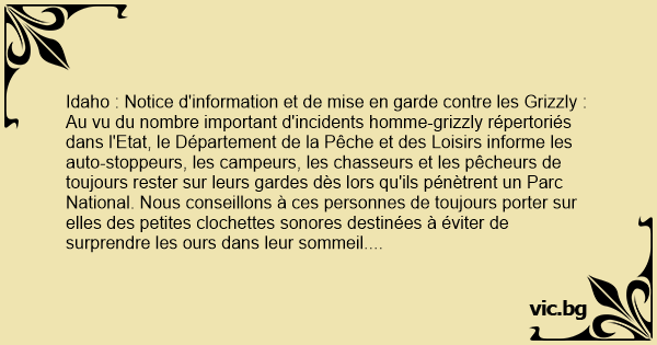Idaho : Notice d'information et de mise en garde contre les Grizzly :