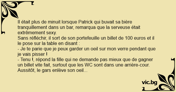 Il était plus de minuit lorsque Patrick qui buvait sa bière tranquillement dans un bar, remarqua que la serveuse était extrêmement sеxy.